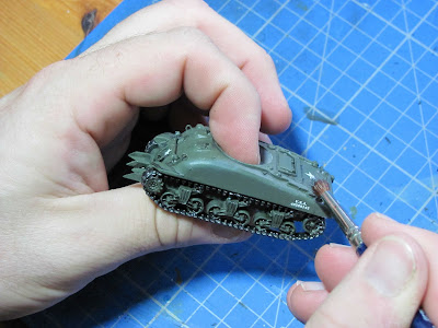 Beginnen möchte ich mit ein wenig Vorschattieren von Ecken und Vertiefungen auf der Oberfläche des Sherman. Ich benutze hierfür USA Olive Drab von Model Color, das ich stark mit Wasser verdünnt habe und dann mit einem Pinsel der Größe 0 auf das Modell aufgetragen habe. Dieser Farbauftrag dient dazu, dem eigentlichen Anstrich an den so präparierten Stellen mehr Tiefe zu verleihen. Zwar sieht diese Vorschattierung ein wenig grob und ungeschickt aus, doch der Eindruck täuscht und ist durchaus gewollt. Wenn der Grundanstrich in Grün über allem liegt, und dieses mit ein wenig Thinner oder Wasser verdünnt wurde, schimmert das Oliv Drab an diesen Stellen leicht hindurch, was gleichzeitig einen verwitterten Farbverlauf zur Folge hat. Wem das Oliv Drab vielleicht zu stark Aufgetragen wurde, der kann diese auch ein paar Minuten nach dem Anbringen wieder retuschieren. Hierzu braucht er bloß den Pinsel in ein wenig Airbrush Reiniger tauchen und die überschüssigen Schatten wieder ein wenig zu entfernen.